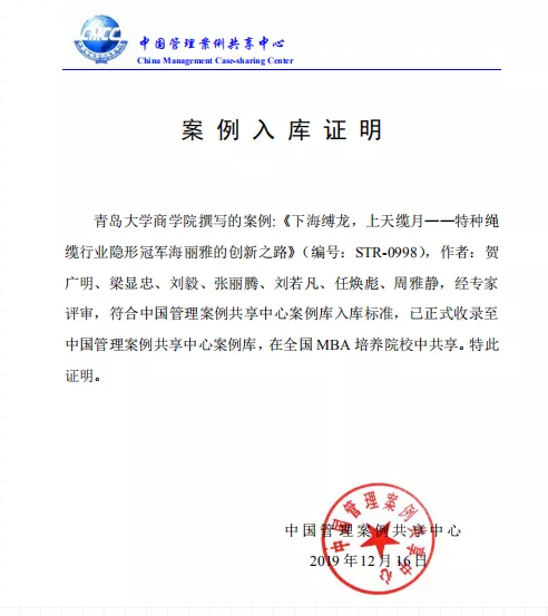 青島海麗雅集團(tuán)·華凱海洋科技有限公司堅(jiān)持走“專、精、特、新”的發(fā)展戰(zhàn)略,通過國際領(lǐng)先的產(chǎn)品開發(fā)水平和技術(shù)創(chuàng)新能力,堅(jiān)持產(chǎn)品品質(zhì)戰(zhàn)略,不斷提高自身核心競爭力,成為代表中國特種繩纜行業(yè)走向世界的領(lǐng)軍企業(yè)。2018年,公司作為特種繩纜行業(yè)隱形冠軍的典型學(xué)術(shù)研究案例,入選浙江大學(xué)“隱形冠軍”國際研討會。2019年,該案例入選“中國管理案例共享中心案例庫”,在全國高校MBA教育課程中共享。