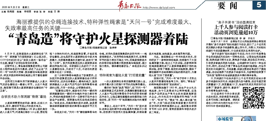 按照計(jì)劃,“天問(wèn)一號(hào)”將于明年2月到達(dá)火星并開(kāi)展著陸準(zhǔn)備等工作。屆時(shí),“青島造”的特種繩索將接受“實(shí)戰(zhàn)測(cè)試”。