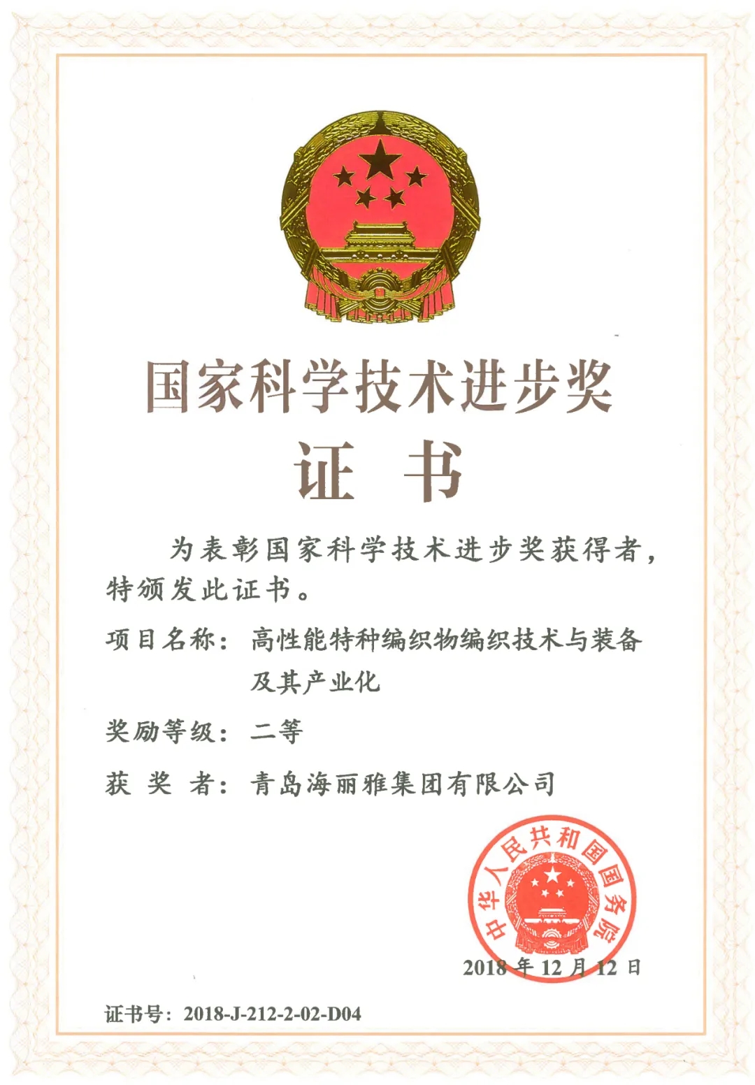 青島海麗雅集團(tuán)“高性能特種編織物編織技術(shù)” 斬獲國(guó)家科技進(jìn)步獎(jiǎng)二等獎(jiǎng)。