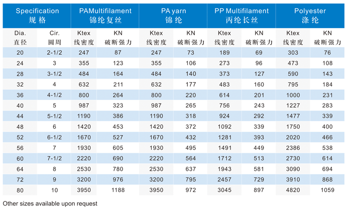 It has serial products including varieties of nylon, polypropylene filament, polypropylene, polypropylene/polyester mixed, polyester. Imported SEI1/16-600 16 ply braided to fill up the gap of rope-making industry in our country, its special braided structure and technology craft rise up the utilization rate of strength of fiber thus to make the rope have advantages of low elongation, wearing resistance, smooth and pliable tough provides ideal product for special requirement for customers.